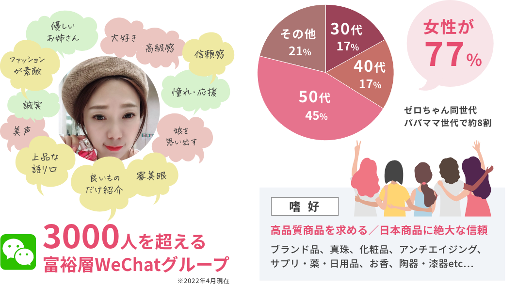 ゼロちゃんのファンは買物好きの「大人の高所得者」。TaobaoやTikTokライブの利用者と一線を画す属性で、「メイドインジャパンの高品質商品」を積極的に購入して行きます。